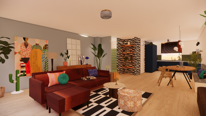 Een vrolijk stel met beide een levendige persoonlijkheid. Dit willen we natuurlijk vertalen naar een interieur die bij hen persoonlijk aansluit! Kleur en energie. Een mix van modern en vintage. We combineren gedurfde prints met heel veel kleur. De fijne en ruime zithoek nodigen uit tot ontspanning terwijl de verlichting zorgt voor een warme gloed en een fijne sfeer. De eethoek is het middelpunt van de woning en de keuken een droom! De donkerblauwe kleur zorgt voor pit terwijl de strakke Kitkat- wandtegels en grafische behang met veel contrast zorgen voor verbinding met de rest van de ruimte. Wij zijn verliefd op het resultaat en de bewoners ook!